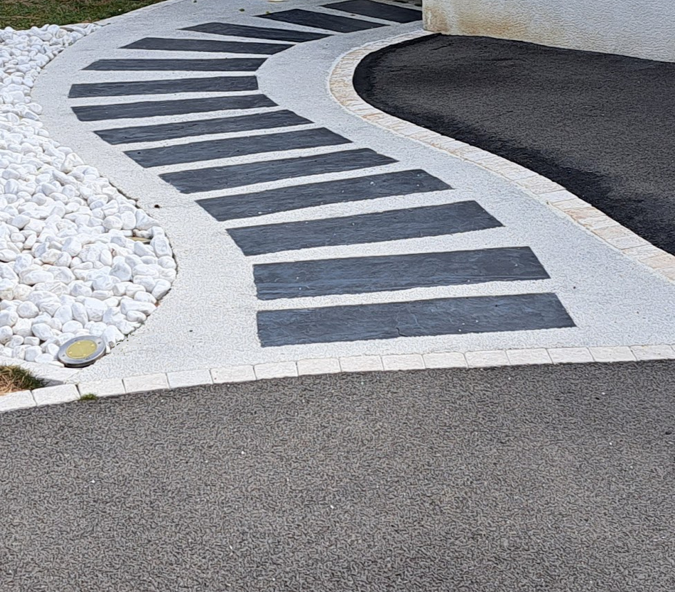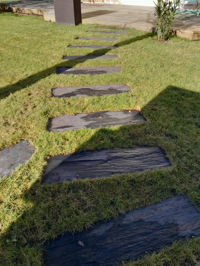Terrasses, allées, bordures, pas japonais, passage, contour de bassin, etc... Le schiste s'adapte facilement à tous vos projets d'aménagement éxtérieurs.